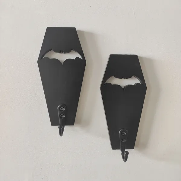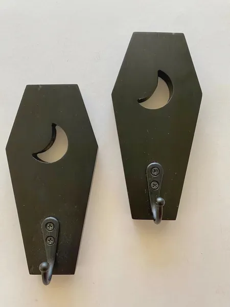 Handcrafted Wooden Coffin Hooks with Moon & Bat Cutouts – Perfect for Gothic, Halloween, and Alternative Home Decor