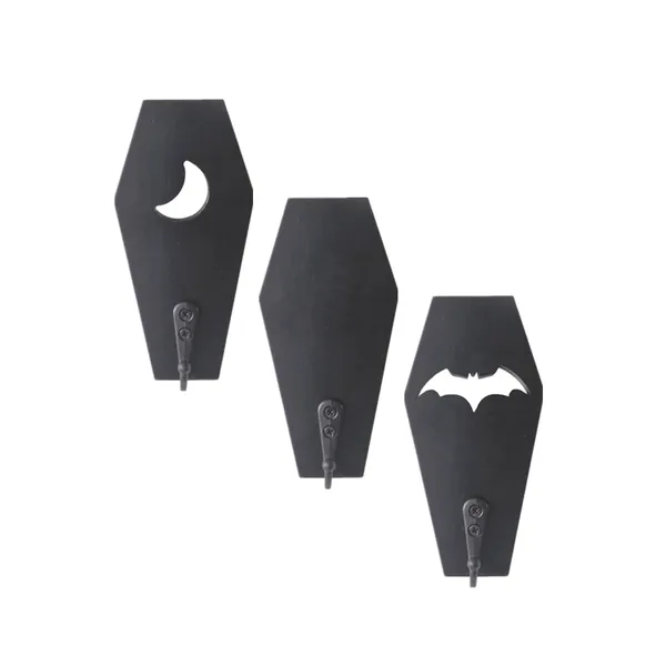 These black coffin-shaped wooden wall hooks are designed for gothic, Halloween, and alternative-style interiors. Each hook is crafted from durable solid wood, finished with a matte black coating, and features optional moon, bat, or plain cutout designs. Strong metal hooks and secure screw mounts ensure reliable hanging performance for clothing, accessories, bags, keys, and small décor.